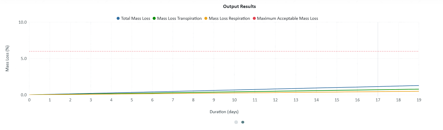 - Total Mass Loss (%): Depicts weight loss progression, reflecting respiration and transpiration effects.