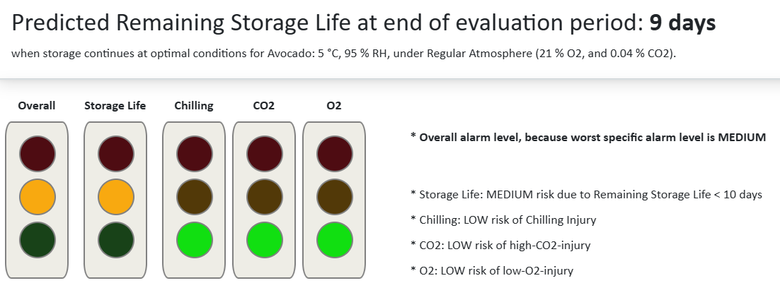 It also integrates respiration and transpiration processes to calculate realistic shelf-life estimates. Remaining storage life represents how long a product can be stored at its optimal temperature (Topt) in a regular atmosphere before quality becomes unacceptable.